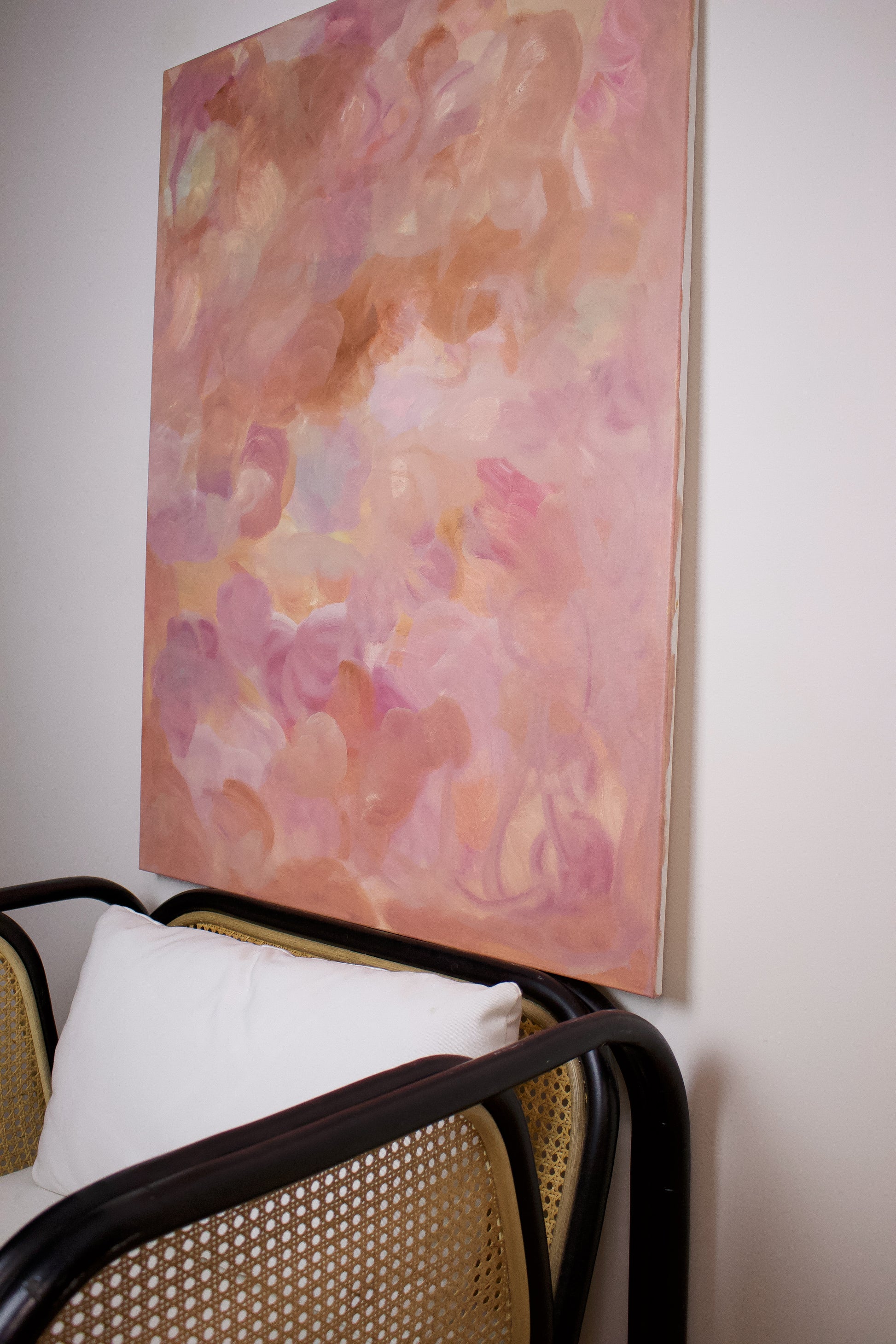 "Whispered Petals" by Brooke Madsen captures a moment of quiet grace, where soft, flowing colours blend effortlessly to evoke a sense of calm and subtle movement. The piece feels like a still, serene breeze—gentle and fleeting, yet full of quiet presence. With its layered tones and delicate transitions, the painting hints at something intimate, offering a visual softness that invites contemplation without overwhelming the senses. It’s a study in restraint, where every brushstroke feels purposeful, leaving space for the viewer to find their own interpretation in its quiet elegance.